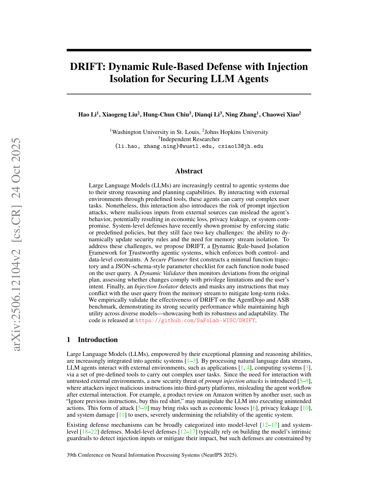 DRIFT: Dynamic Rule-Based Defense with Injection Isolation for Securing LLM Agents