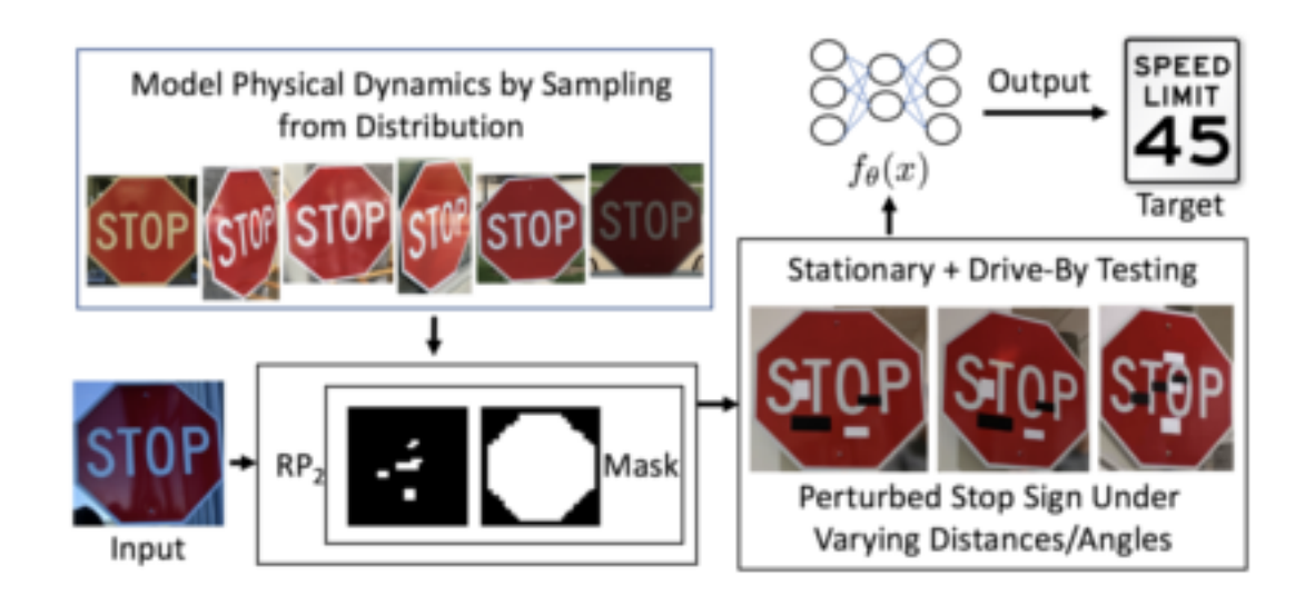 Kevin Eykholt*, Ivan Evtimov*, Earlence Fernandes, Bo Li, Amir Rahmati, Chaowei Xiao, Atul Prakash, Tadayoshi Kohno and Dawn Song CVPR, 2018